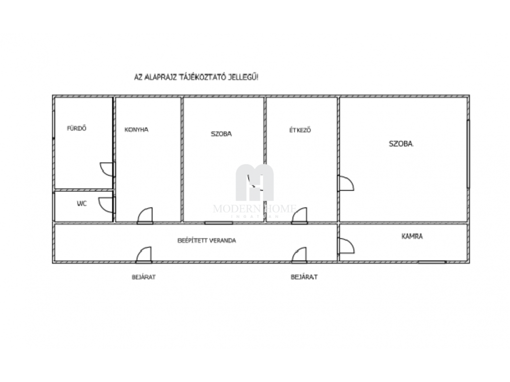 Elosztása: 2 szoba + 1 konyha + 1 étkező + kamra + fürdő + wc, + beépített veranda. Az ingatlan oldal illetve hátsó rész irányába bővíthető.
