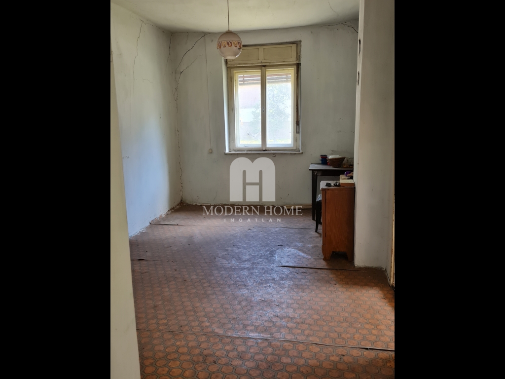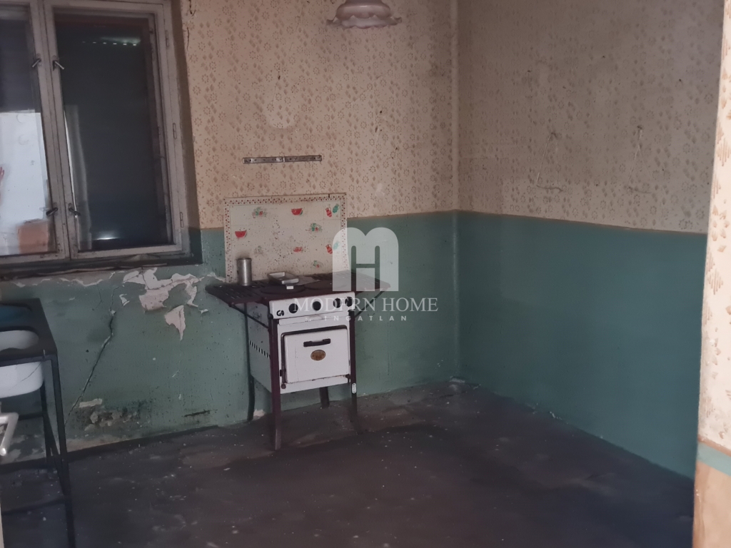 Elosztása: beépített veranda + 1 szoba + közlekedő + konyha + fürdő + wc + kamra.