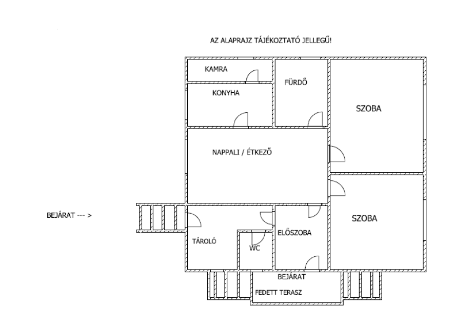 3) elosztása: fedett terasz + előszoba + 2 szoba + nappali/étkező + konyha + kamra + fürdő + wc + tárolóhelység.