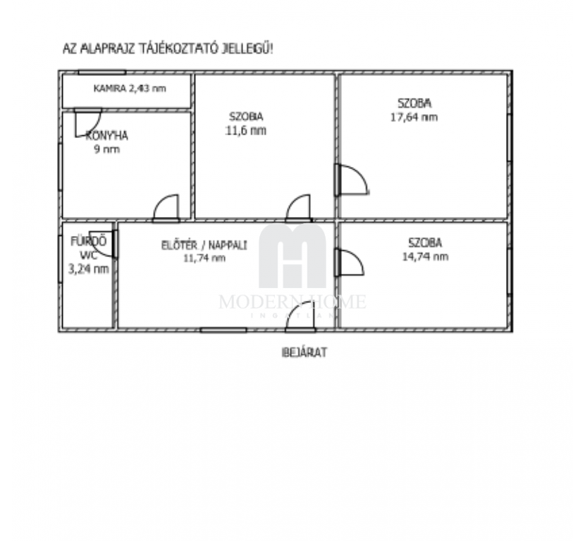 Elosztása: előtér / nappali + 3 szoba + konyha + kamra + fürdő.