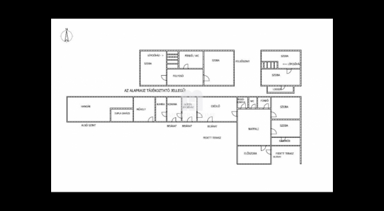 alsó szint: előszoba + nappali + 2 szoba + gardrób + fürdő / wc – mosókonyha – étkező + konyha + kamra + lépcsőház.