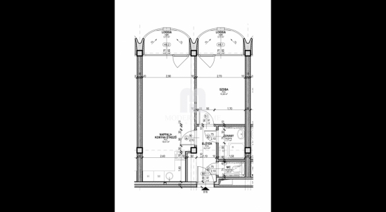6)elosztása: előtér + amerikai konyha – nappali – étkező + 1 szoba + fürdő + wc.