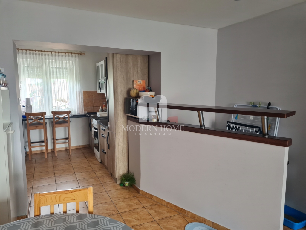 Elosztása: előtér + amerikai konyha – nappali – étkező + 1 szobás, fürdő + wc + gang.