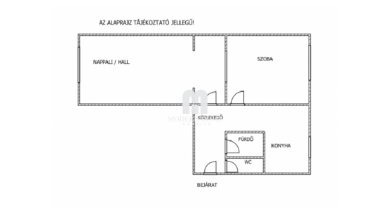 Elosztása: közlekedő + nappali + hall + 1 szobás + konyha + fürdő + wc.