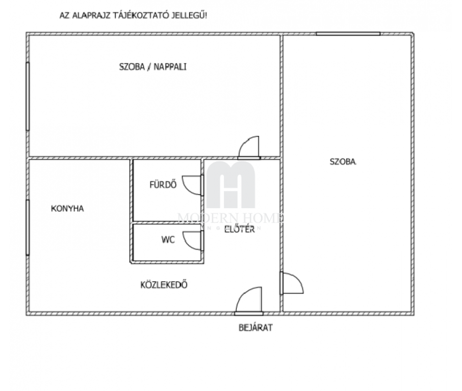 •elosztása: előtér + 2 szobás + közlekedő + konyha + fürdő + wc.
