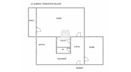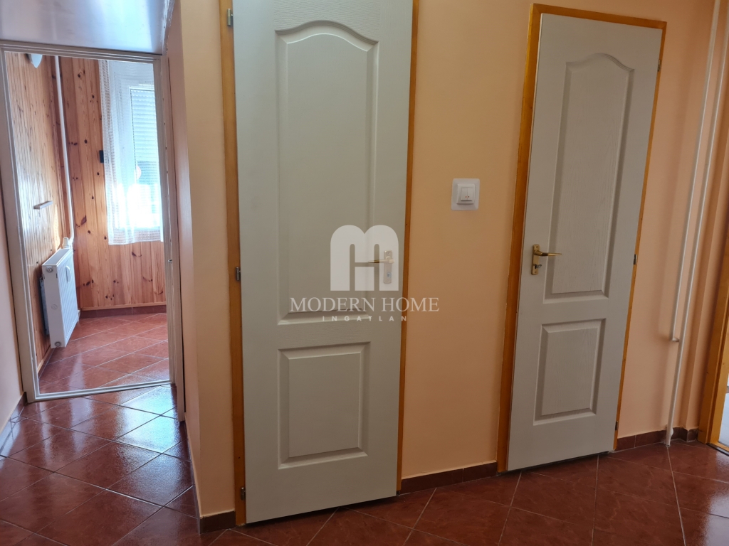 Elosztása: előtér + 2 szobás + közlekedő + konyha + fürdő + wc + erkély.