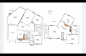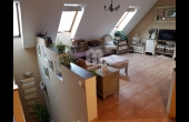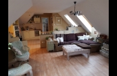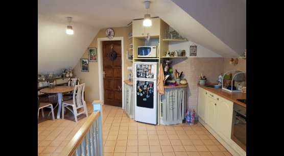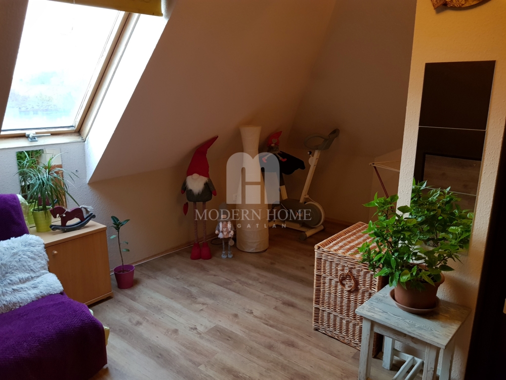 Felső szint: 64 nm, 2 félszoba + gardrób + nappali + konyha + étkező + fürdő + wc.