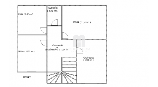 Emeleten: 3 szoba + gardrób + fürdő + wc.