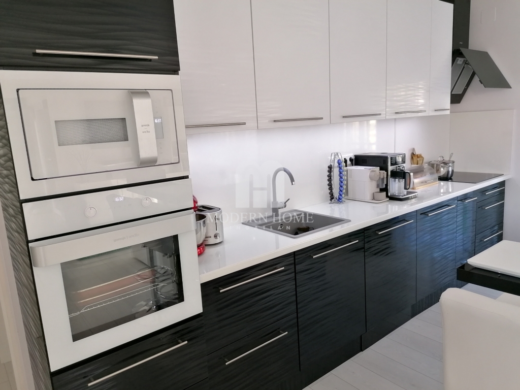 A konyhában GORENJE minőségi – első osztályú konyhai gépek, és az arculatot fokozza a gurulós konyhasziget, illetve a fürdőben található dupla mosdó – épített zuhanykabinnal / fürdőkáddal + mosókonyhával kiegészítve.