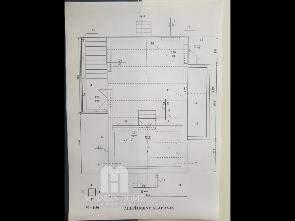 Az alsó szinten ( ami 45 nm ) nappali + fél szoba + fürdő + wc és fedett terasz.